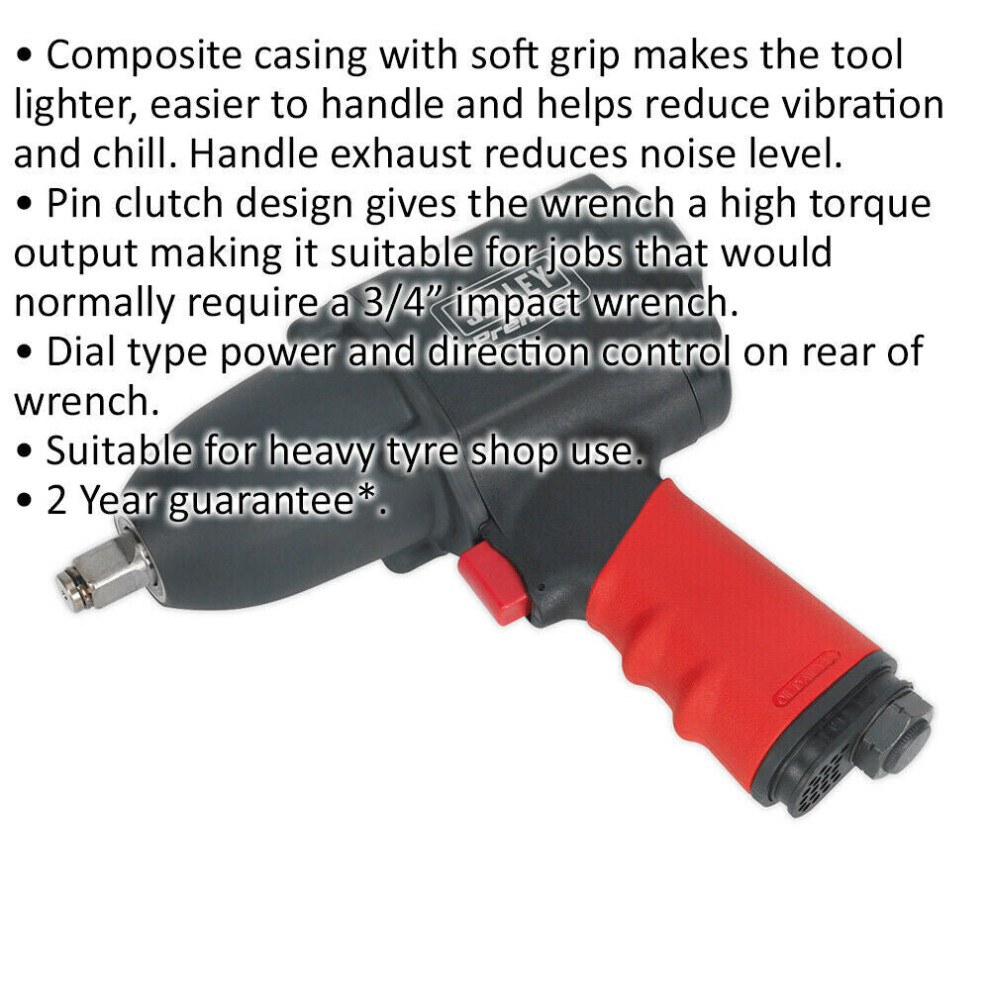 Composite casing with soft grip makes the tool lighter, easier to handle and helps reduce vibration and chill. Handle exhaust reduces noise level. Pin clutch design gives the wrench a high torque output making it suitable for jobs that would normally require a 3/4" impact wrench. Dial type power and direction control on rear of wrench. Suitable for heavy tyre shop use.